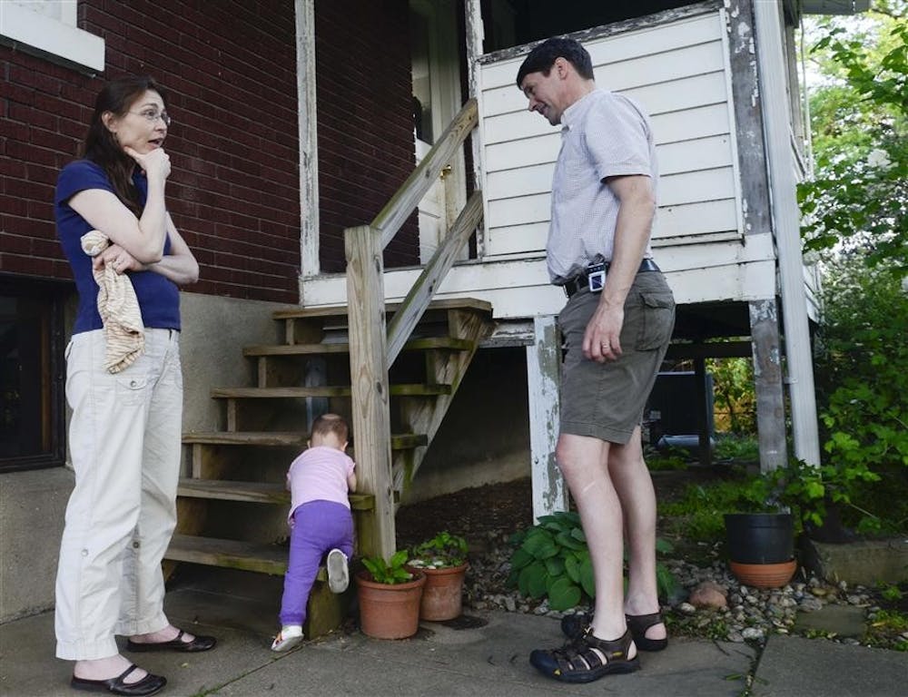 Jody holds Sleepytime Tiger as she and Jim talk with one another outside their home in Louisville and Willa practices climbing the stairs to their back porch on April 15. Jim and Jody have been completely moved back into their home for a few weeks now that Willa is done with Proton treatments and the family could not be happier.