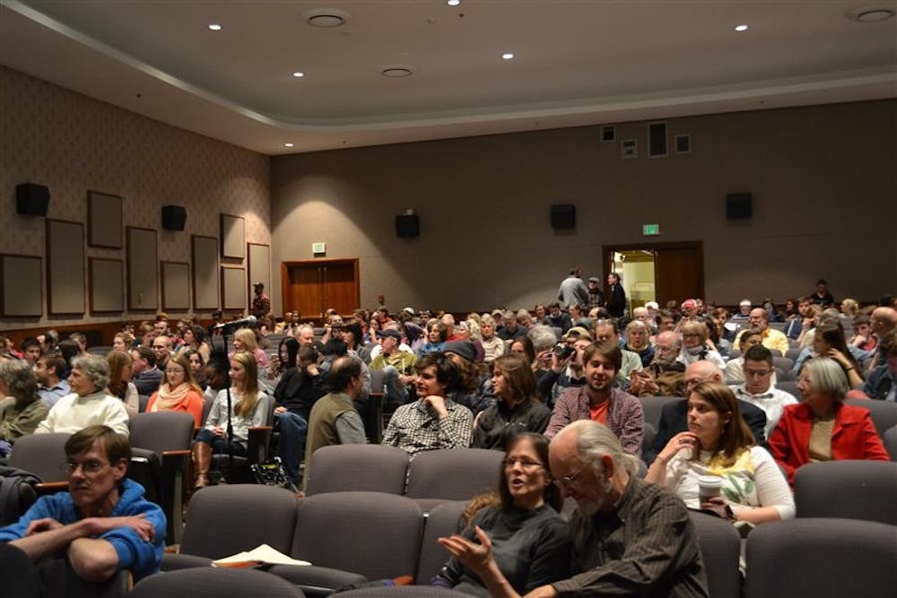 Students and members of the Bloomington community attend Will Allen's lecture Tuesday night at the Whittenberger Auditorium. This lecture is a part of Indiana University Bloomington's 2014 SustainIU week. Rachel Meert