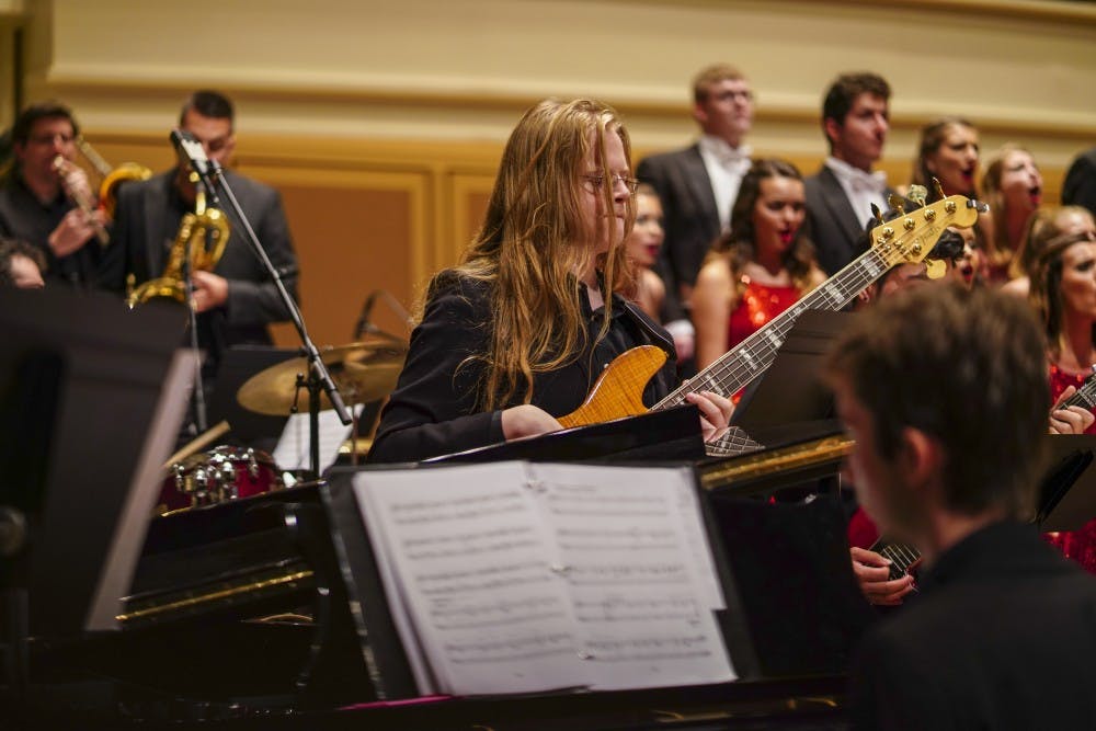 A small band accompanies the Singing Hoosiers and is directed by IU professor Chris Albanese during the dress rehearsal Oct. 19 in Auer Hall. Some members of the band alternated between instruments, and Albanese made special note of the song “Saturn” which features a synthesizer.