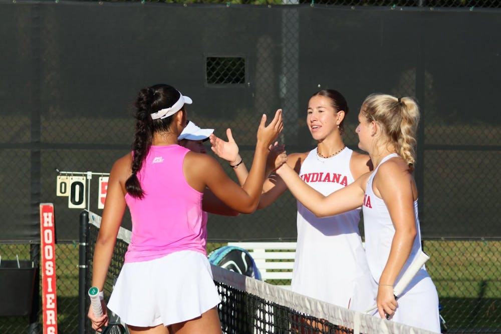 Indiana and Butler double partners shake hands after their match at the Hoosier Classic on Oct. 3, 2025, at the IU Varsity Tennis Courts in Bloomington. Teams from Bellarmine University, Butler, Chicago State University, Louisville, Northern Illinois University and Purdue joined Indiana for the Hoosier Classic tournament.