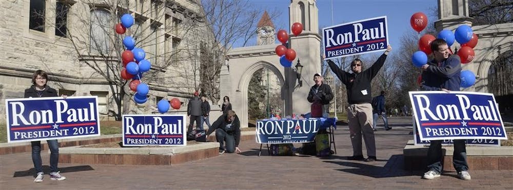 Members of the IU chapter of Youth for Ron Paul hold up signs to bring awareness Sunday at the Sample Gates. Steph Langan
