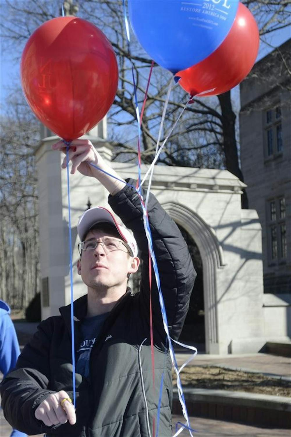 Junior Nate O'Connor grabs a balloon for a student Sunday during a Youth for Ron Paul event Sunday at the Sample Gates. Steph Langan