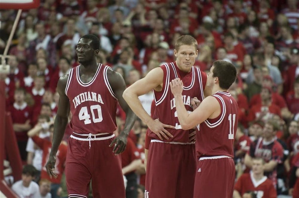 Sophomore guard Daniel Moore speaks with freshman forward Derek Elston during IU's 83-55 loss to Wisconsin Feb. 13 at the Kohl Center in Madison, Wisc. Peter Stevenson