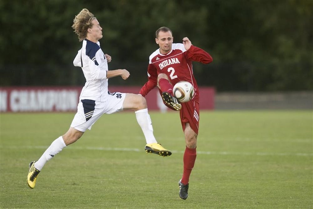 Senior defender Rich Balchan clears the ball away from Notre Dame's Greg Klazura during IU's 2-1 loss to the Irish on Wednesday at Bill Armstrong Stadium. Peter Stevenson