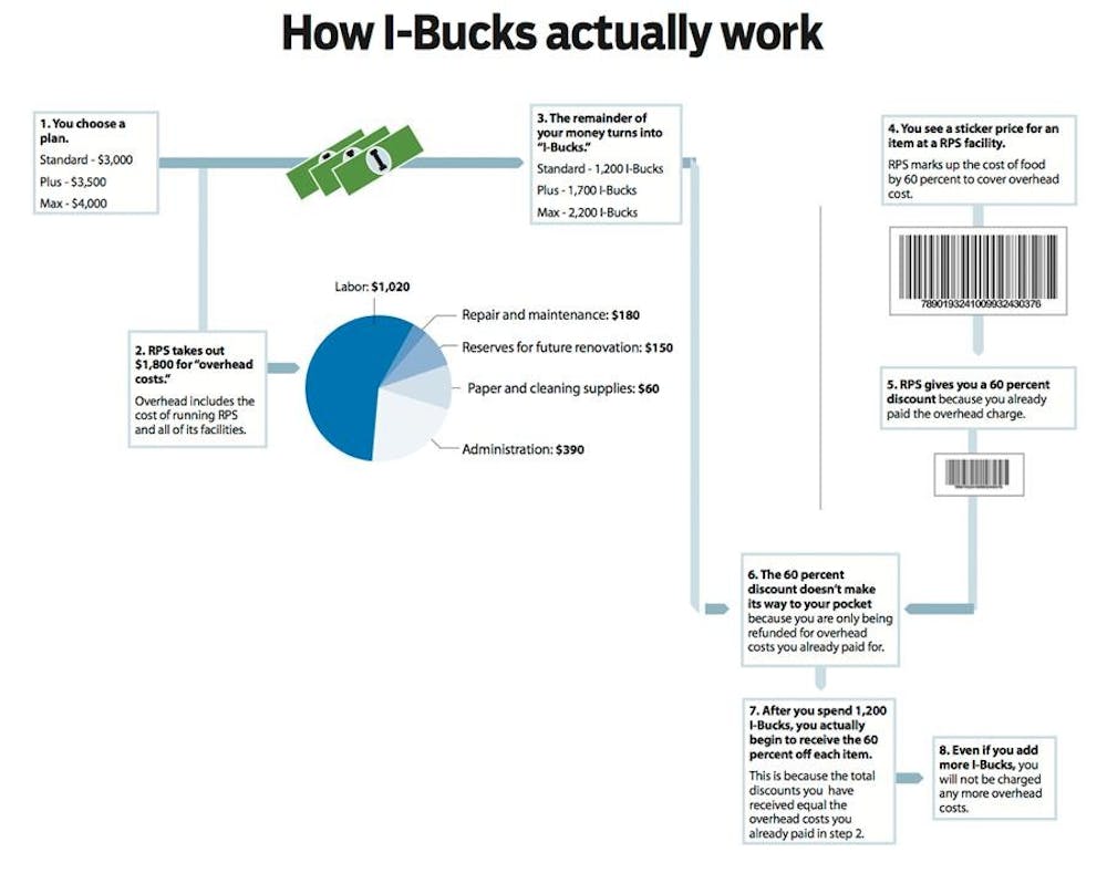 This graphic explains the I-Bucks system and how it affects students with meal plans.