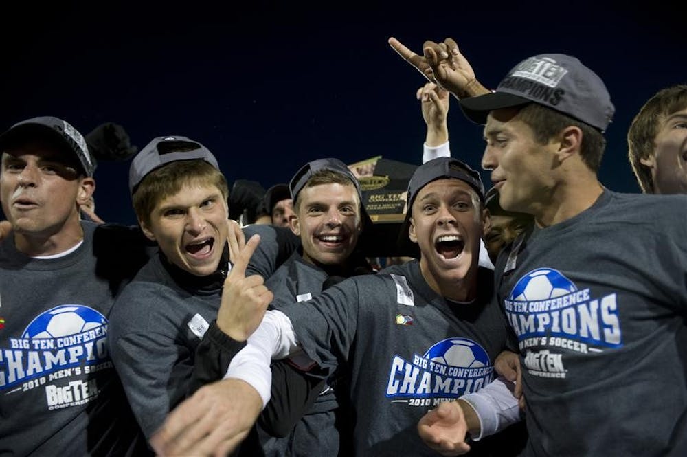 Junior forward Alec Purdie (second from right) and teammates celebrate after winning the Big Ten Championship on Sunday at Bill Armstrong Stadium.