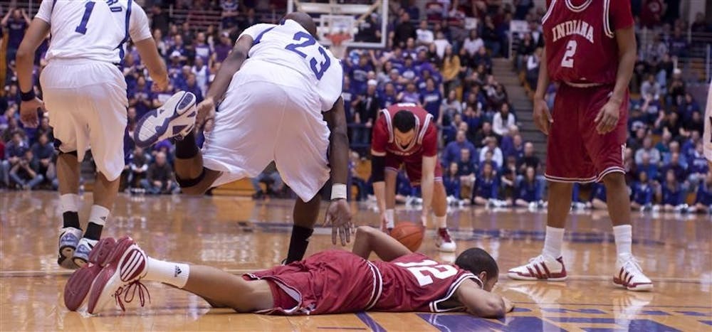 Sophomore guard Verdell Jones lays on the floor after tangling with Northwestern's Jeremy Nash during IU's 78-61 loss to Northwestern Feb. 7 in Evanston, Ill. Peter Stevenson