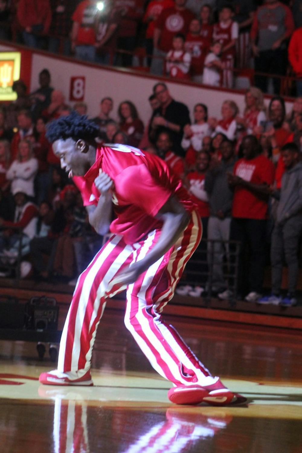 OG Anunoby dances his way onto the court after being announced. Anunoby received his BIG 10 Championship ring during Hoosier Hysteria Saturday evening.