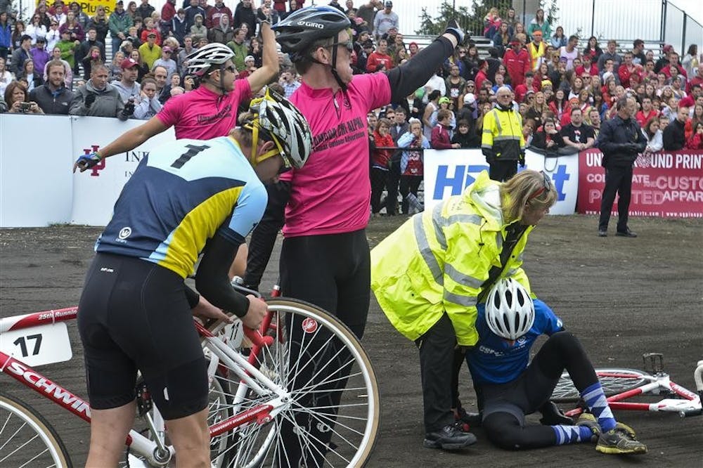 An Alpha Tau Omega rider attempts to wedge the handle bars of a Lambda Chi Alpha bike out of his wheel after a wreck at turn three as a CSF rider is helped off the ground at the 2012 men's Little 500 on Saturday at Bill Armstrong Stadium.
