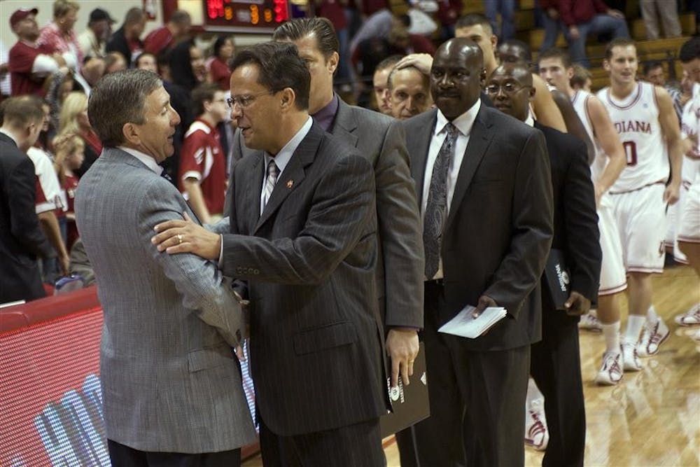IU coach Tom Crean shakes hands with Franklin College coach Kerry Prather after the Hoosiers' 89-37 win against the Grizzlies on Wednesday at Assembly Hall.