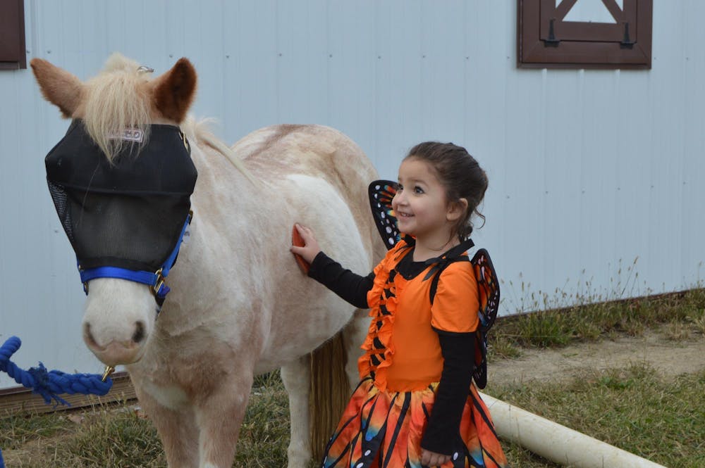 Karlee Pridemore brushes a horse at the People and Animals Learning Services’ "Halloween with the Horses" event Oct. 25, 2025, at 7644 W. Elwren Road in Bloomington. The event included activities like horse bobbing for apples, trick-or-treating and face painting.