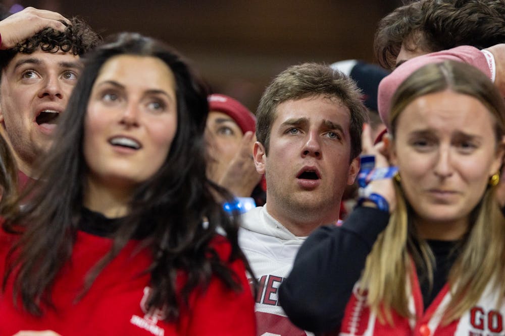 An IU football fan reacts during the Big Ten Championship game against Ohio State on Dec. 6, 2025, at Lucas Oil Stadium in Indianapolis. The crowd for the game broke the Big Ten Championship attendance record. Briana Pace