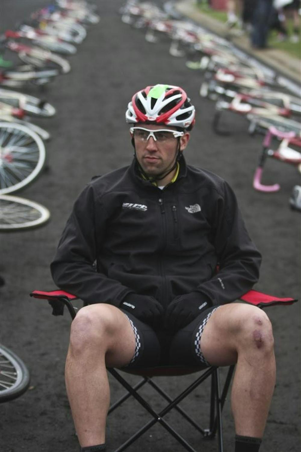 Cutters' rider Eric Young sits in a lawn chair while waiting for the start of the 2011 men's Little 500 on Saturday at Bill Armstrong Stadium. Mark Felix