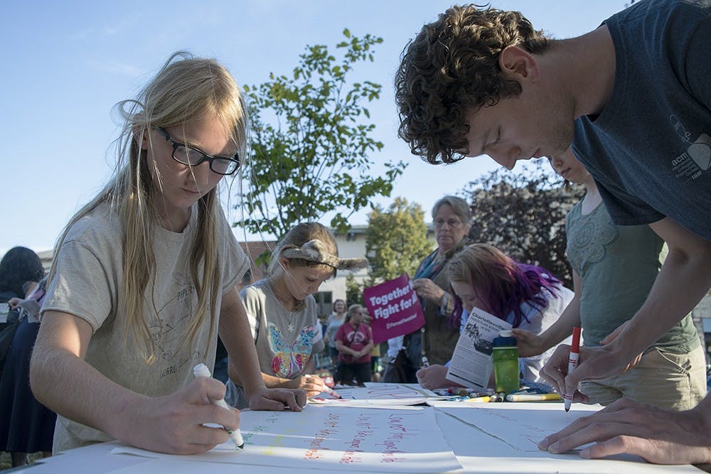Owen McCloud, 10, works on a sign for the rally. It read, “Love not hate conquers more hate.” Emily Eckelbarger and Emily Eckelbarger