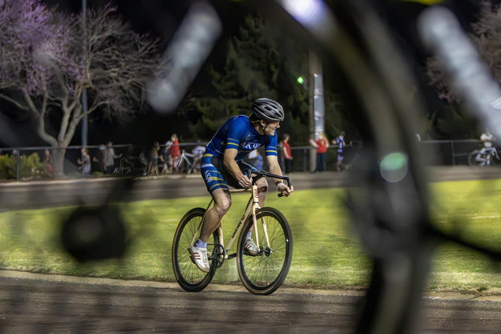 An Alpha Kappa Psi racer turns around the second turn during his individual time trial on Mar. 31, 2026 at Bill Armstrong Stadium in Bloomington. The individual time trials kicked off the first event of the racer's spring series.