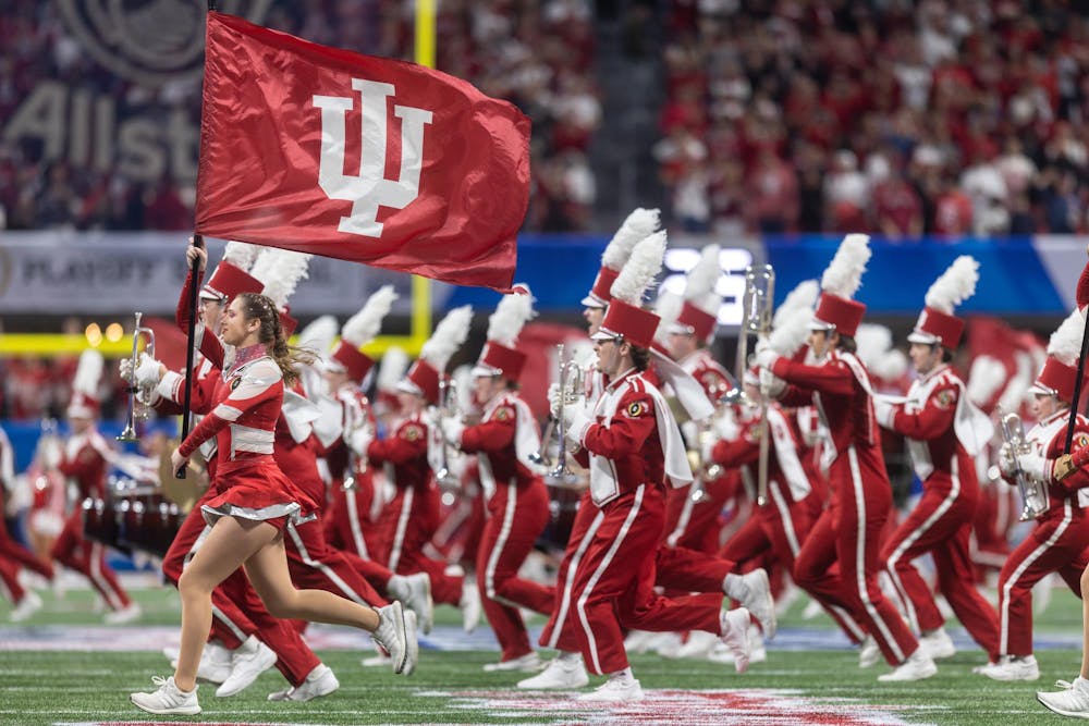 Indiana University's Marching Hundred runs onto the field before the College Football Playoffs Semifinal game against Oregon on Jan. 9, 2026, at Mercedes-Benz Stadium in Atlanta. The band performed the national anthem. Briana Pace
