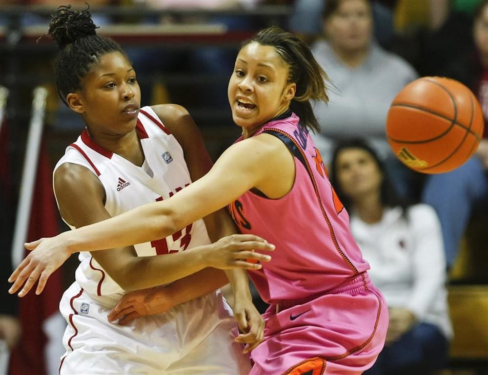 Freshman point guard Candyce Ussery throws a pass around the outstretched arms of an Illinois defender during IU's 61-60 loss Sunday at Assembly Hall. Mark Felix