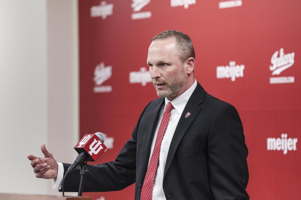 Indiana men’s basketball head coach Darian DeVries is pictured during his introductory press conference March 19, 2025, at Simon Skjodt Assembly Hall in Bloomington. Indiana's 2025-26 regular season schedule was announced Thursday.
