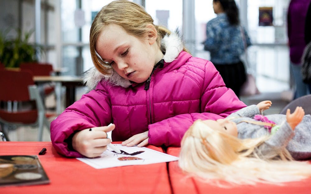 An elementary-age girl colors a Dr. Martin Luther King Jr. sketch at the MLK Birthday Celebration. The community teach-in, for both children and their families, took place Sunday in the IU School of Education. The celebration included coloring activities, a musical performance, an interactive discussion and a celebratory birthday cake.