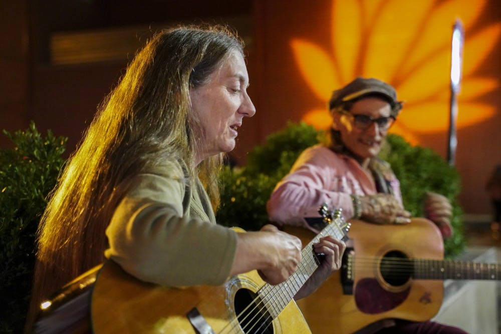 Bloomington residents Linda Windforest and Kay Bull play guitar together during the 2018 Lotus World Music & Arts Festival on Sept. 29. Windforest said that they don’t usually play with each other but came together to do street performances during Lotus.