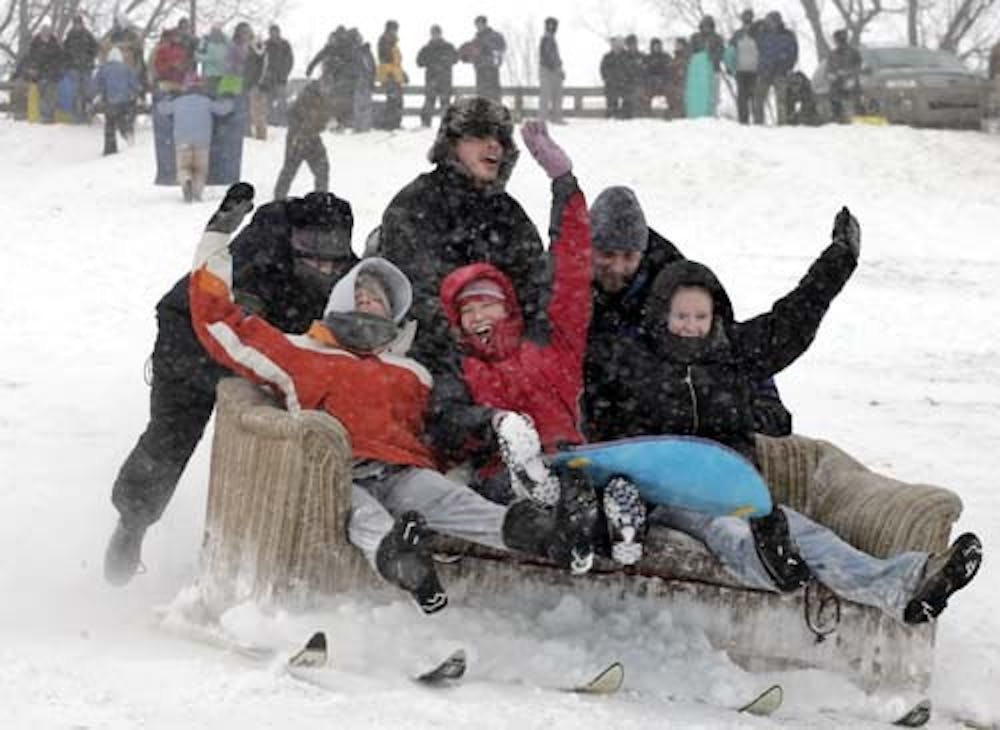 Alli Osborn, Tasha Stevens and Sarah Moran, take a ride on the Sleigh-z-Boy, a couch with skis, in West Lafayette, Ind., Tuesday. The Purdue students were taking advantage of the snow day at school by sledding at Slayter Hill. (AP Photo/Journal and Courier, Frank Oliver)