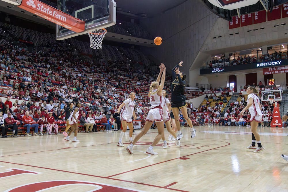 Sophomore forward Faith Wiseman defends Northwestern senior guard Caroline Lau during the game Feb. 1, 2026, at Simon Skjodt Assembly Hall in Bloomington. Wiseman played 14 minutes in the game. Chloe LaVelle