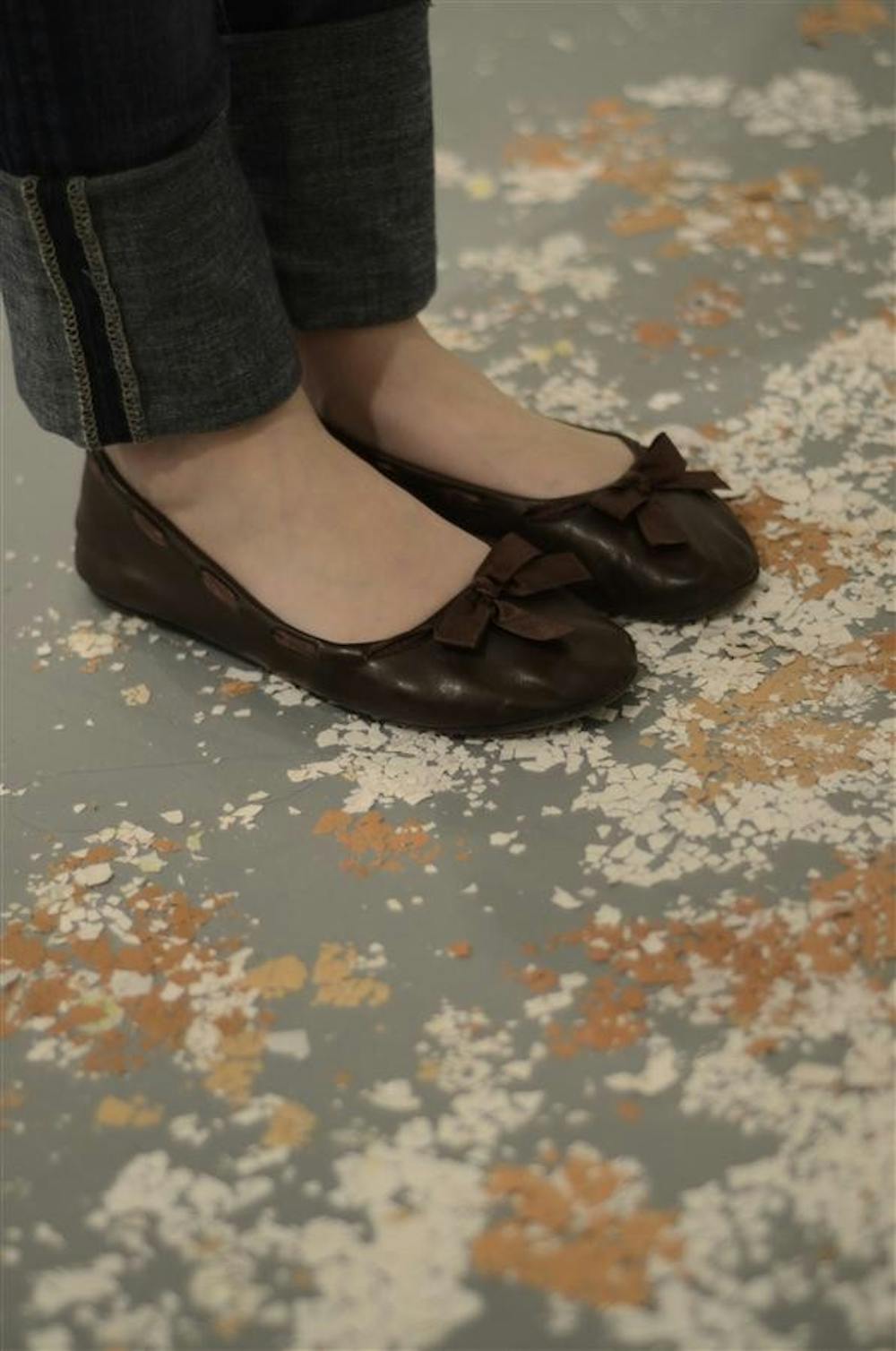 A visitor to the Flesh, Blood and Bone exhibit steps on broken eggshells Friday at the McCalla School. Artists used less practical mediums to create the work in the exhibit. Steph Langan