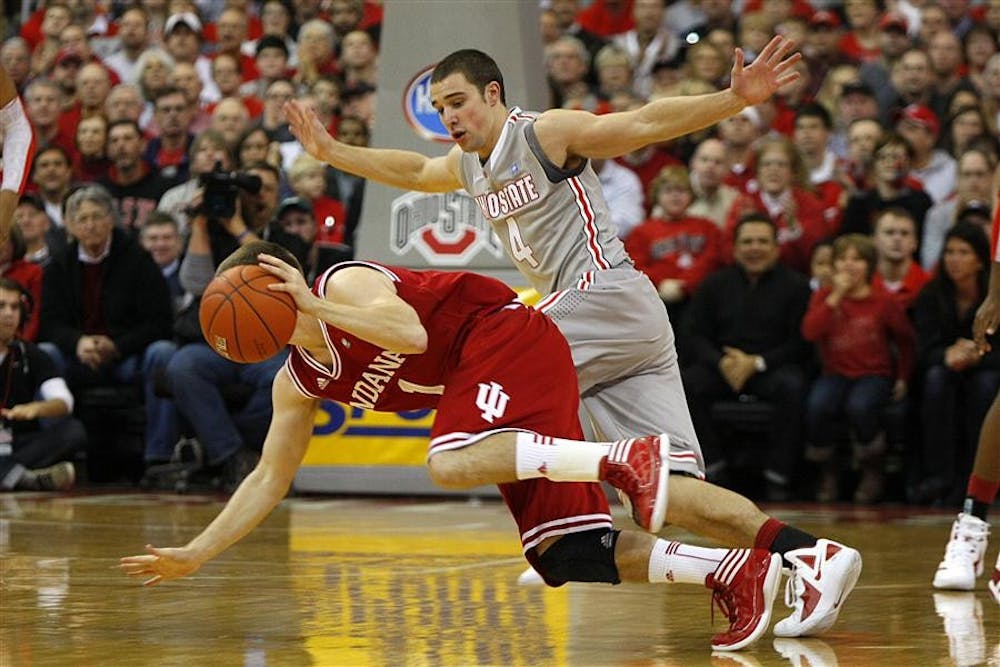 Junior point guard Jordan Hulls falls while trying to dribble past Ohio State's Aaron Craft Sunday at Value City Arena. Mark Felix