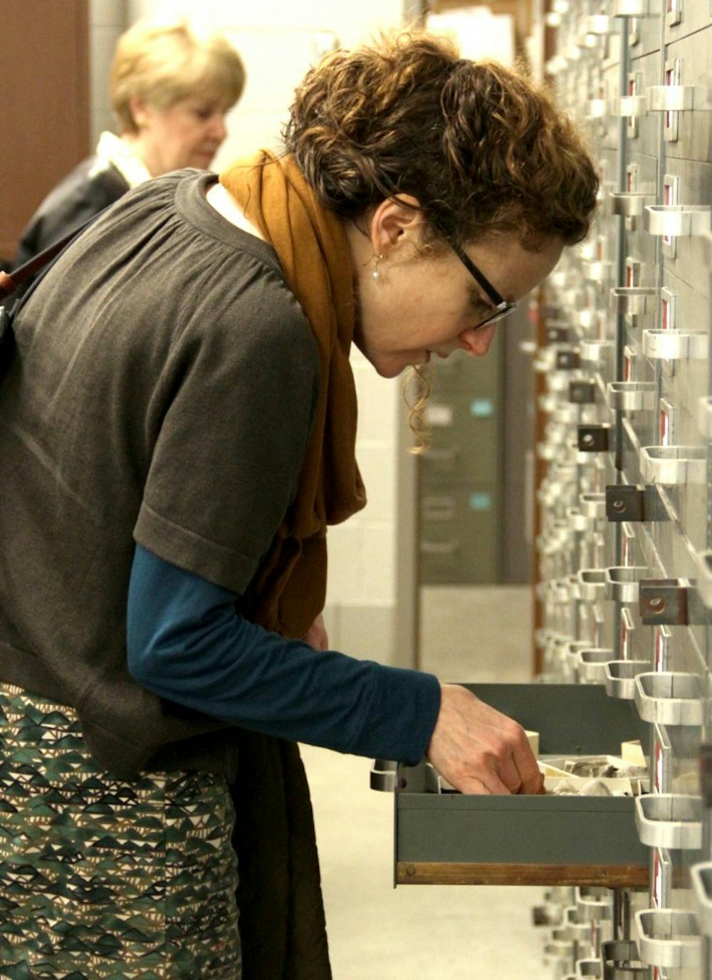 Rebecca Spang, one of the visitors, examines the fossils during the IU Paleontology fossil showcase on Saturday at Geology building. Stella Devina and Stella Devina
