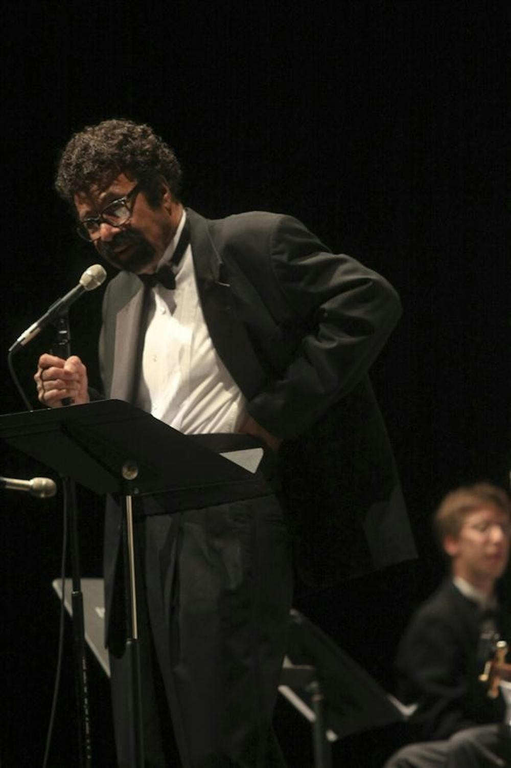 Jazz ensemble Director David Baker talks with the audience in between songs during the Jazz Ensemble performance Monday at the Music and Arts Center. The next performance of the David Baker Jazz Ensemble will take place Oct. 25. Mark Felix