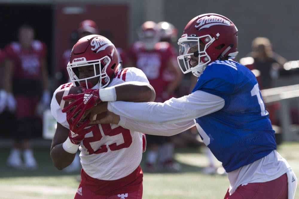 Graduate transfer quarterback Brandon Dawkins hands the ball off to freshman defensive back Devon Matthews during practice Monday morning at the IU football practice fields. Dawkins is a graduate transfer from Arizona.