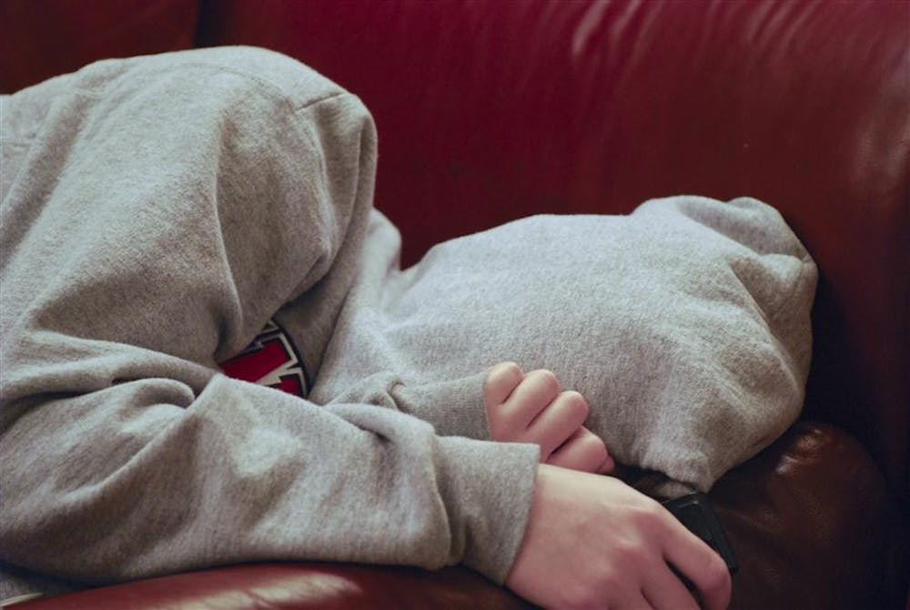 A student rests on one of the East Lounge's red leather couches Nov. 15 in the Indiana Memorial Union. Claire Wiseman