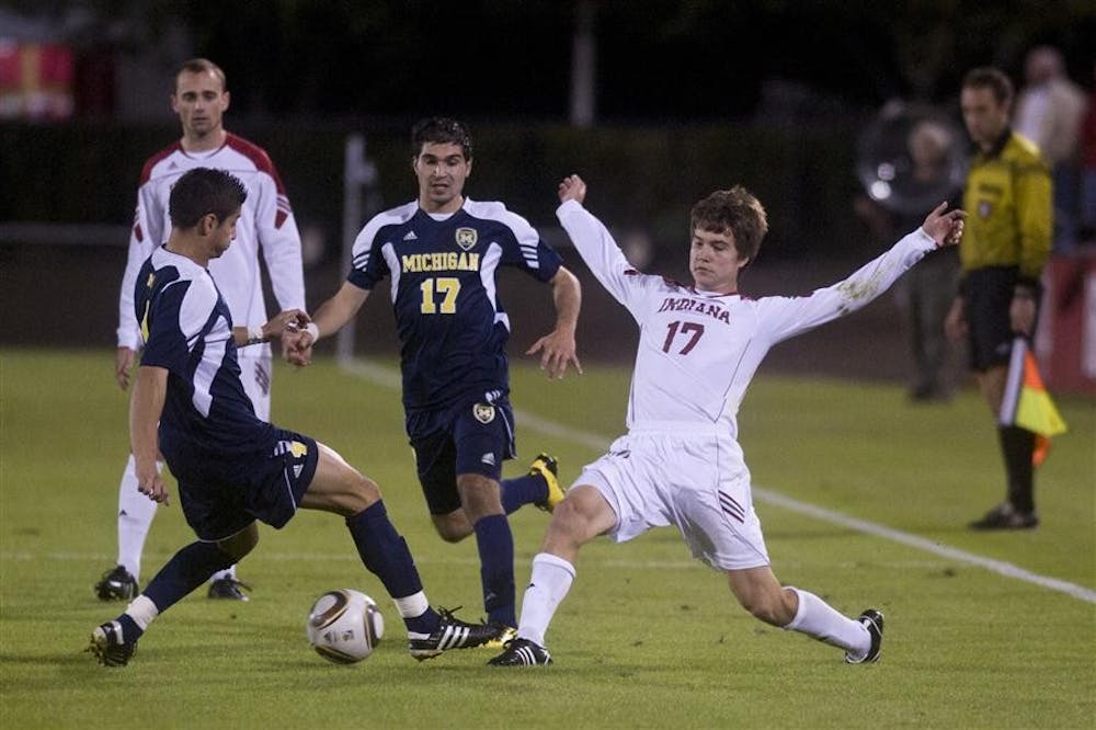 Freshman midfielder Jacob Bushue dispossesses Michigan's Dylan Mencia during IU's 2-1 win against the Wolverines on Saturday at Bill Armstrong Stadium.