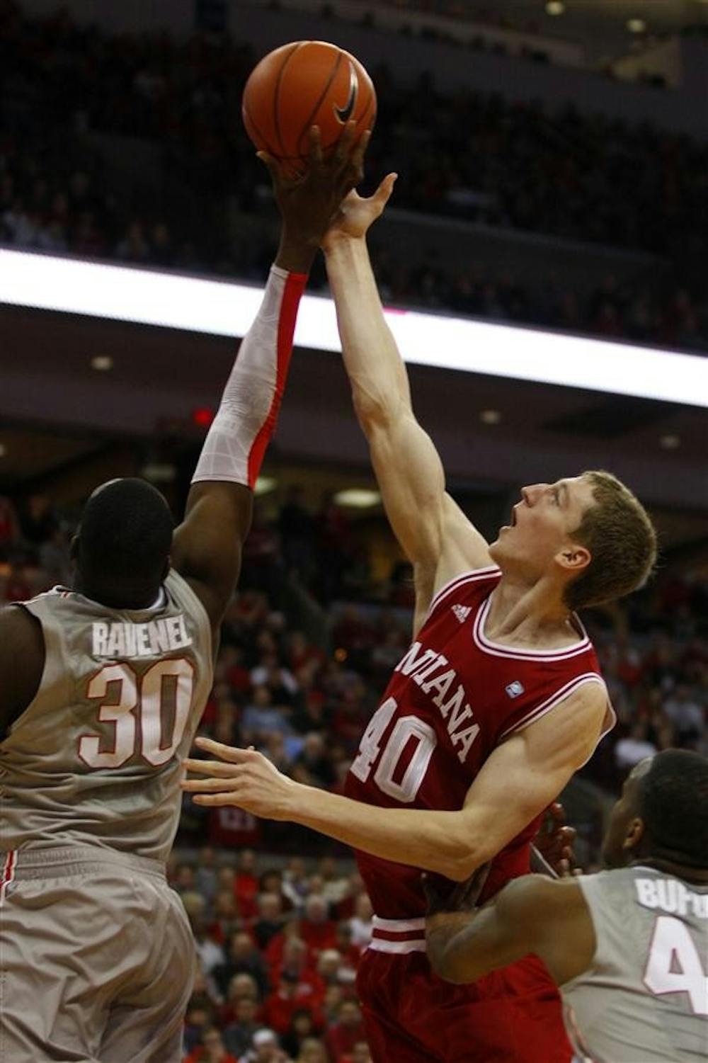 Freshman center Cody Zeller fights for a rebound with Ohio State's Evan Ravenel Sunday at Value City Arena. Mark Felix