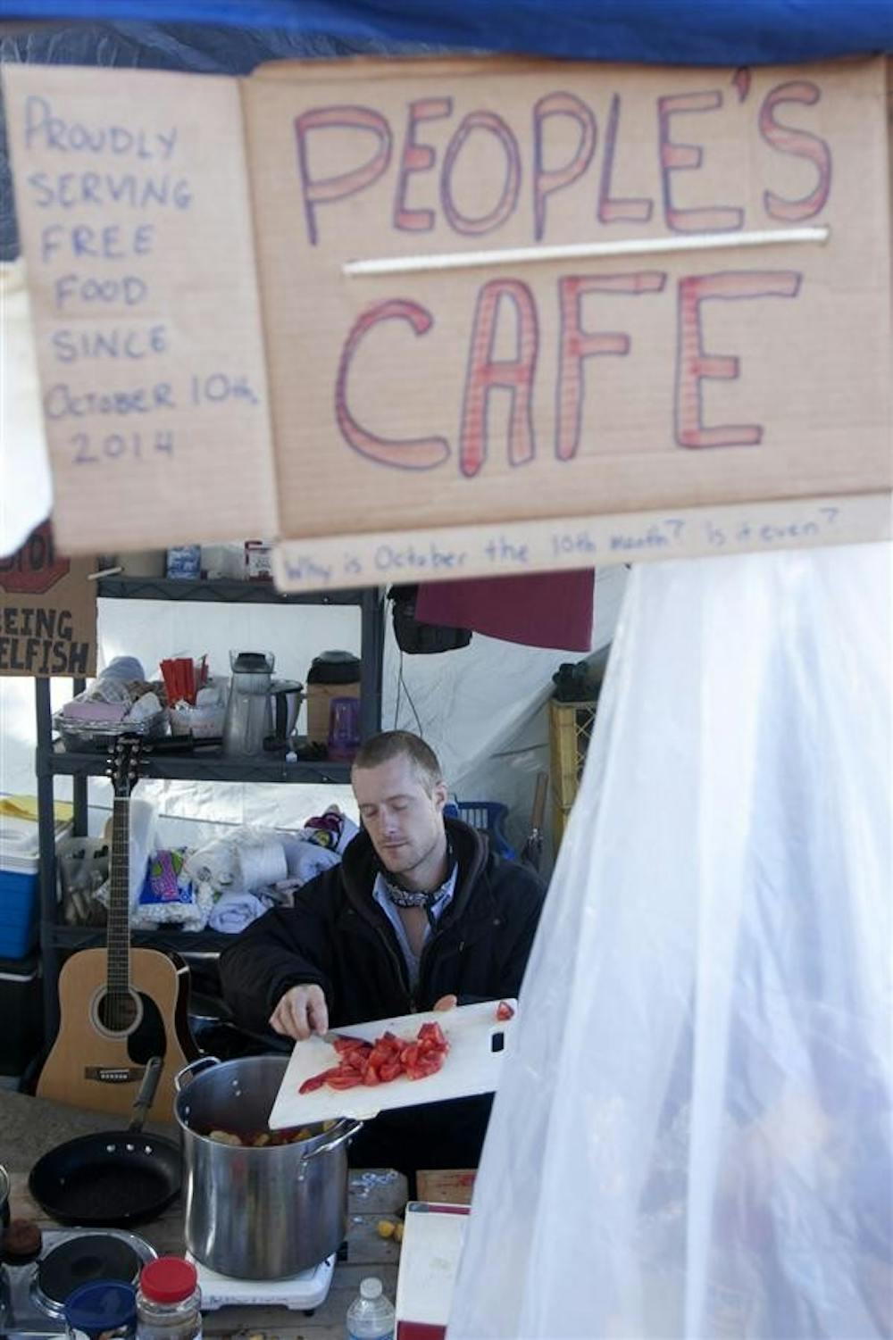 Blane cuts up tomatoes and prepares a vegetable dish Saturday in People's Park. Blane is the chef for "People's Cafe" and said there have been generous produce donations given to help feed Occupy Bloomington protesters.