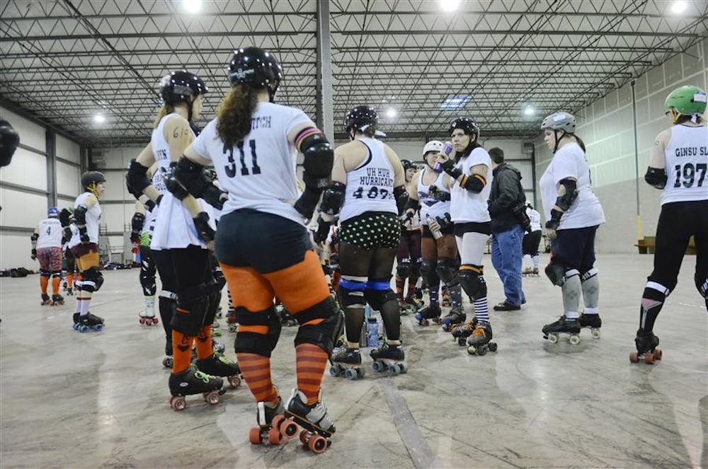 Members the Bleeding Heartland Rollergirls roller derby team take a break for water during warm ups prior to their scrimmage Sunday at their warehouse on N. Curry Pike.