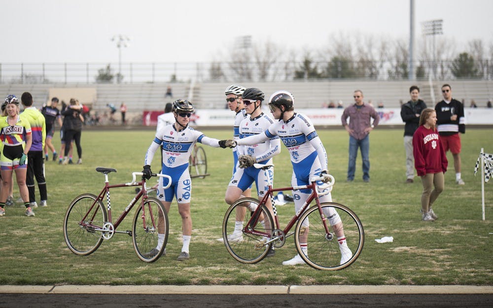 Riders for Phi Delta Theta get ready to attempt to qualify for the Little 500 bike race. Phi Delta Theta along with other frats, sororities and organizations rode for quals Saturday at the Bill Armstrong Stadium.