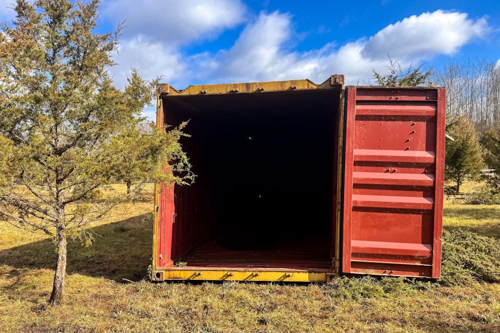 A shipping container lays on Monroe County Humane Association property Feb. 20, 2026, at 791 S. Fieldstone Blvd. in Bloomington. The container left large divots in the ground at nearly perfect right angles.
