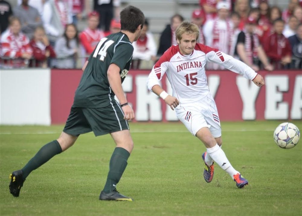 Sophomore midfielder/defender Jamie Volmer moves the ball down field during the Hoosiers' 2-2 tie against Michigan State on Sunday at Jerry Yeagley Field.