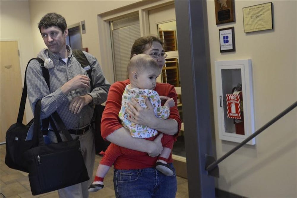 Louisville residents James (Jim) Frankenberger, 47, and Jody Held, 46, walk through the Indiana University Proton Therapy Center in Bloomington, Ind. with their daughter Willa Rose Frankenberger, 19 months, after a proton treatment on March 7, 2012. Diagnosed with a brain tumor in July of 2011, Willa underwent chemotherapy treatments and then moved on to proton therapy at the IU Proton Therapy Center. Jim and Jody took Willa to therapy appointments at the center five days a week for six weeks in an attempt to ensure that the possibility of the tumor returning is highly unlikely.