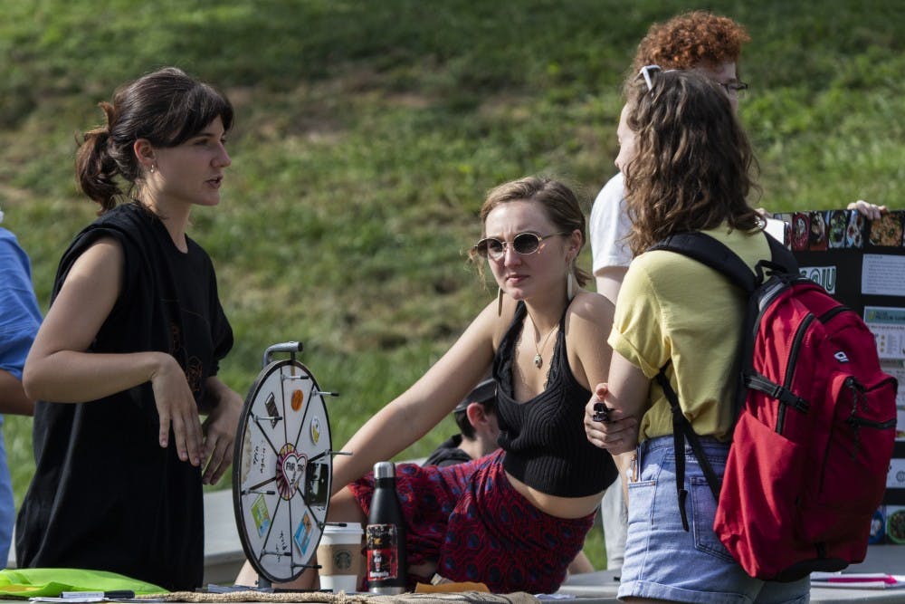 Juniors Zoe Crim and Annie King talk about about their Fair Trade at Indiana University club Aug. 29 in Dunn Meadow. The club is a student advocacy group that focuses on environmental sustainability. Alex Deryn