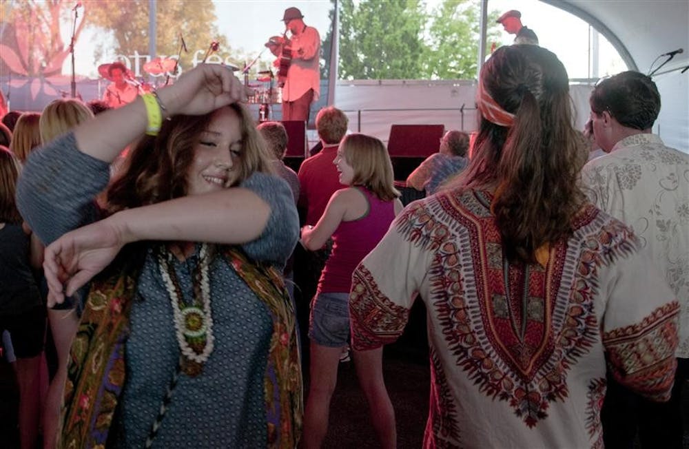 Bryn Hatton and Brandon Hartley dance during Peruvian band Chicha Libre’s show during the Lotus World Music and Arts Festival on Sept. 17, 2010 at the Lifecycle Tent. Olivia Corya