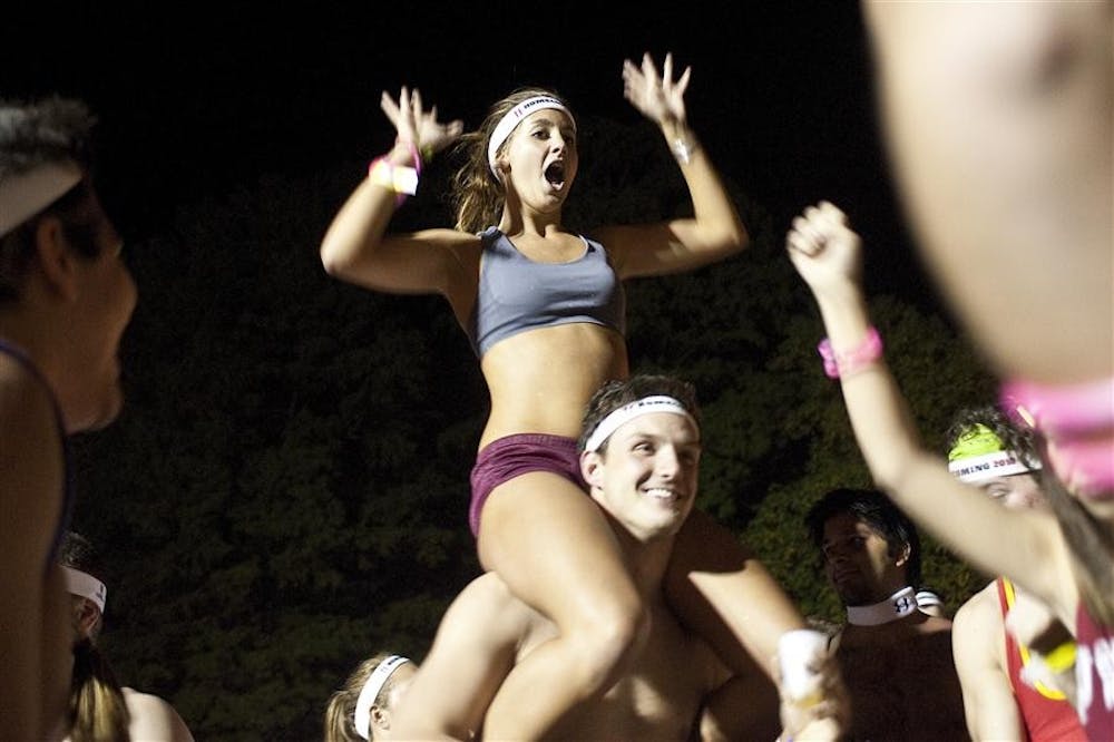 Freshman Roxanne Schrock dances on a friend's shoulders before the start of the Nearly Naked Mile Monday in Dunn Meadow. Peter Stevenson