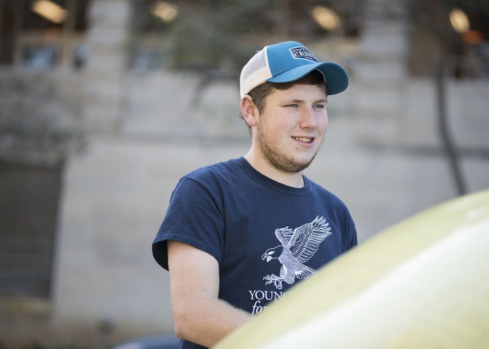 Junior Nicholas Freyberger, member of Young Americans for Liberty, rolls the free speech ball around Thursday. Young Americans for Liberty asked people to write whatever they wanted on the beach ball outside Ballantine.