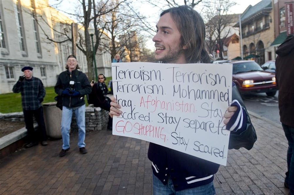 Senior J. Dispenza hold up a sign during rally put on by the 99% Thursday in front of the Sample Gates. The group of people rallying met at 5 pm. Steph Langan