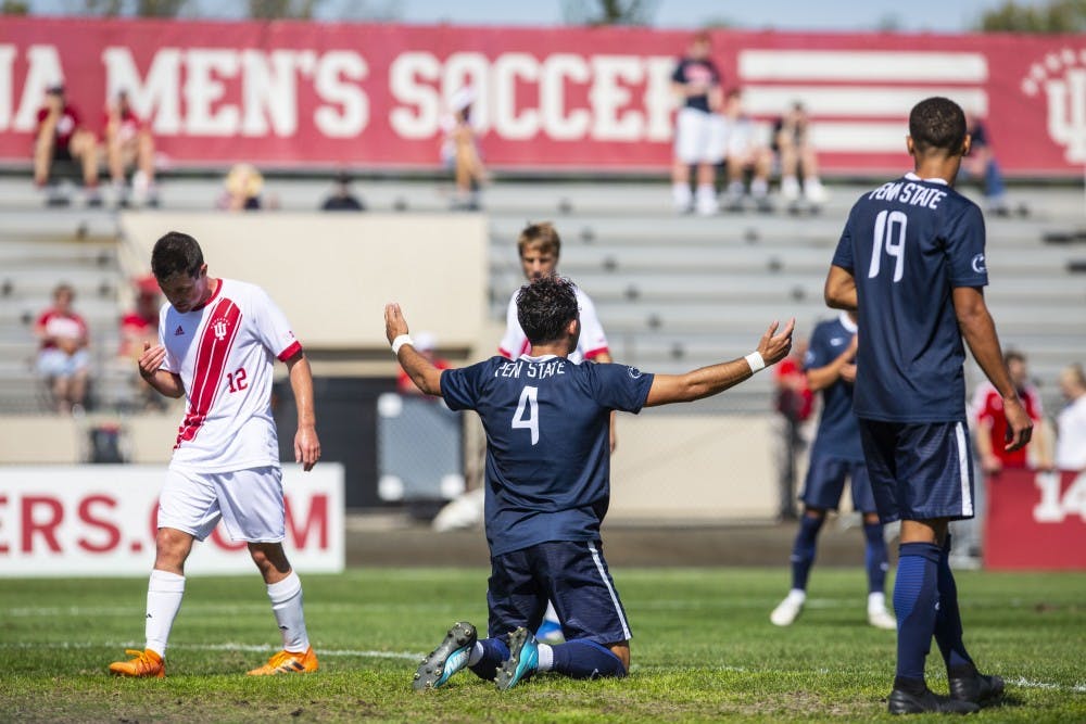 Penn State senior Brennan Ireland raises his arms toward the referee after helping clear the ball from the box Sept. 30 at Bill Armstrong Stadium. Matt Begala