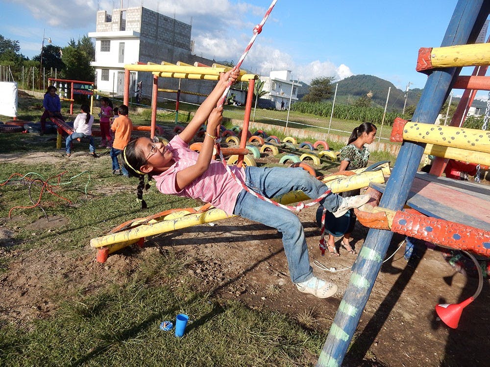 A girl climbs up the side of a new playground. She is one of several students that will now be able to learn and play on a new Play360 playground. Courtesy of Sarah Rosenbaum and Courtesy of Sarah Rosenbaum