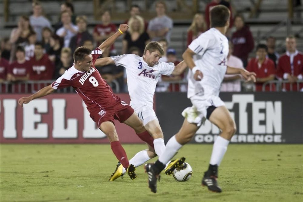 Freshman midfielder Nikita Kotlov attempts to tackle Evansville's Aaron Henkle during IU's 1-0 win against the Purple Aces Wednesday at Bill Armstrong Stadium.