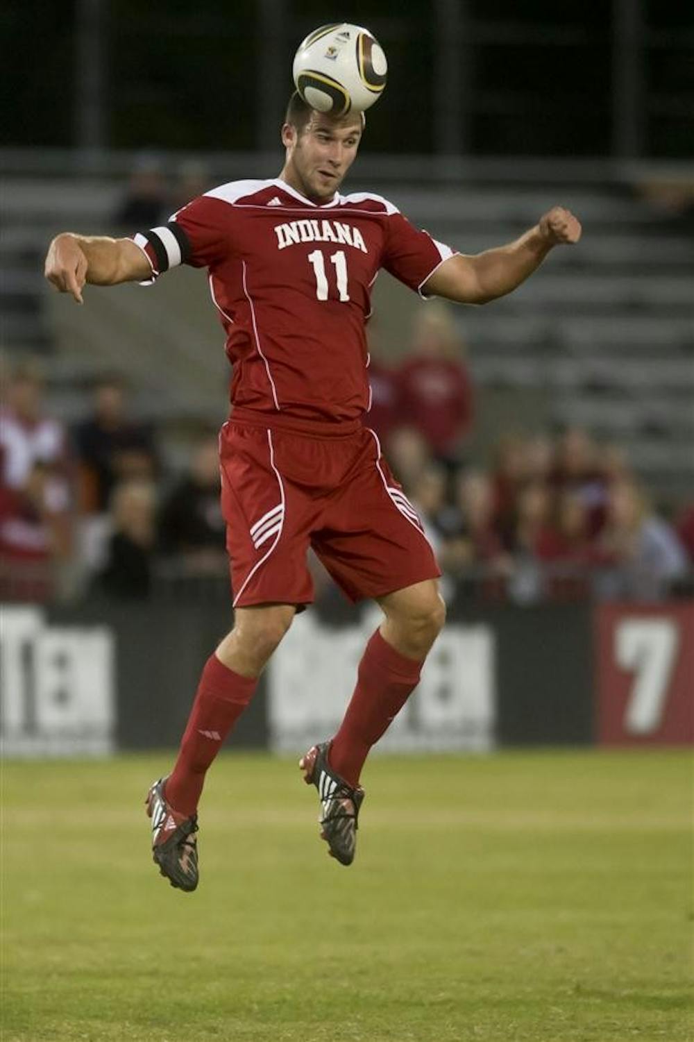 Junior forward Will Bruin heads the ball during IU's 2-1 loss to Notre Dame on Wednesday at Bill Armstrong Stadium. Peter Stevenson