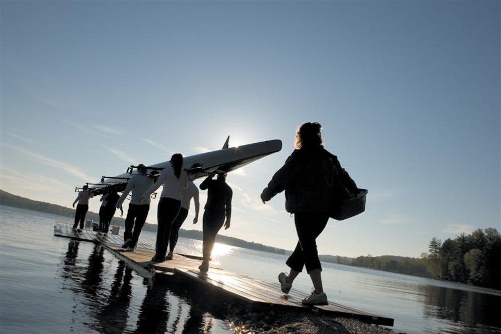 Women's Varsity 8 rowing carry their boat on the on the dock to set in the water on Wednesday, April 27, 2005.